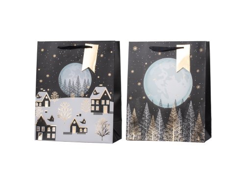 Elegantná darčeková taška o rozmere 260×320 mm s motívmi zimnej krajiny v kombinácii čiernej, bielej a zlatej farby. Vyrobená z kvalitného pevného papiera, doplnená odolnými ušami pre pohodlné prenášanie.