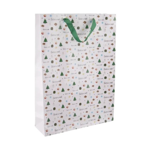 Darčeková papierová taška s motívom Šťastné a veselé. Originál dekor Orion. Materiál papier, polyester (povrázok). Rozmery 32.5 x 10 x 45.5 cm. EAN 8592381232641