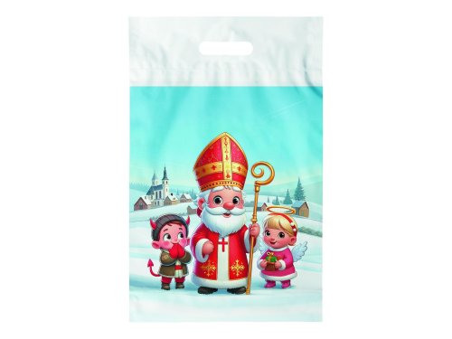 Igelitová taška s prehmatom a farebným mikulášskym motívom. Je ideálny pre rôzne typy darčekov, od malých sladkostí a hračiek až po väčšie predmety. Na taške je obrázok Mikuláša, anjela a čerta. Taška je vybavená prehmatom, čo je otvor v hornej časti tašky, ktorý slúži ako rukoväť. Tento priehmat umožňuje ľahké a pohodlné prenášanie tašky. Vďaka pevnému plastovému materiálu je taška odolná proti roztrhnutiu a vlhkosti, čím zaisťuje, že darčeky vo vnútri zostanú v bezpečí a suchu.