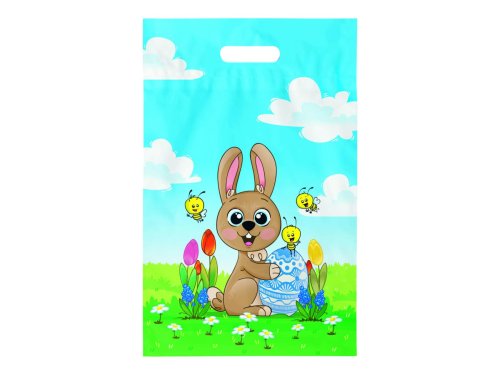 Veľkonočná igelitová taška s uchom je ozdobená veselými veľkonočnými motívmi. Vďaka svojim rozmerom a pevnému materiálu môže byť ideálnou voľbou pre nákupy alebo väčšie veľkonočné výslužky.