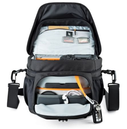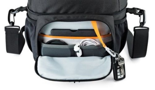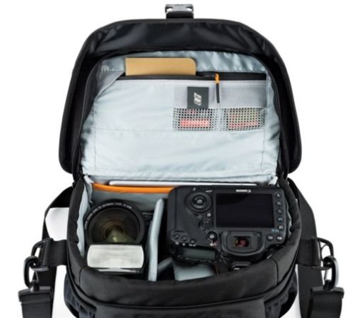 V hlavnej komore je umiestnené samostatné vrecko, do ktorého pohodlne vložíte smartfón alebo tablet. Na vnútornej strane veka hlavnej komory nájdete praktické transparentné vrecko na pamäťové karty a vrecko so zipsom. Predné vrecko na zips je kryté vekom hlavnej komory a má sofistikované vnútorné členenie. Predné vrecko na vonkajšej strane veka hlavnej komory má vodeodolný zips. Dve vonkajšie bočné sieťové vrecká a vrecko na zips na zadnej strane môžete využiť na príslušenstvo a osobné veci.