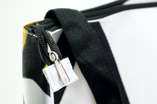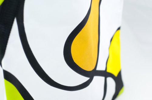 Taška je z odolnej umelej tkaniny s čiernymi ornamentmi a čiernymi uchami. Je opatrená zipsom. Tašku možno prať šetrne v ruke. Doporučená nosnosť je 2 kg.