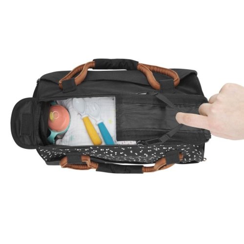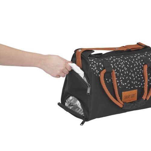 Je to veľmi priestranná taška a ľahko do nej uložíte náhradné oblečenie, plienky, pokrývky, jedlo, zdravotné záznamy atď. Má 5 vonkajších vreciek, z ktorých 2 sú na zips. Vďaka širokému otváraniu do tašky uložíte všetky potrebné veci.