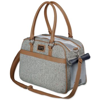 Látková taška zdobená koženkou s penovou výplňou a vreckom.