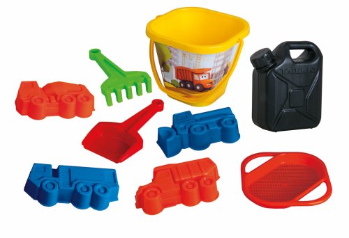 Pieskový set, ktorý obsahuje vedierko so sitkom, hrabličky s lopatkou, 4 bábovky Tatra a kanister