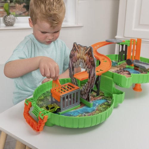 Vydaj sa na dobrodružstvo do sveta dinosaurov s týmto hracím setom v praktickom kufríku v tvare pneumatiky! Vďaka rukoväti ho ľahko prenesieš kamkoľvek. Set obsahuje výťah, klietku, parkovacie priestory a únikovú rampu, ktoré poskytujú nekonečné možnosti hry. Súčasťou balenia je aj jedno autíčko.