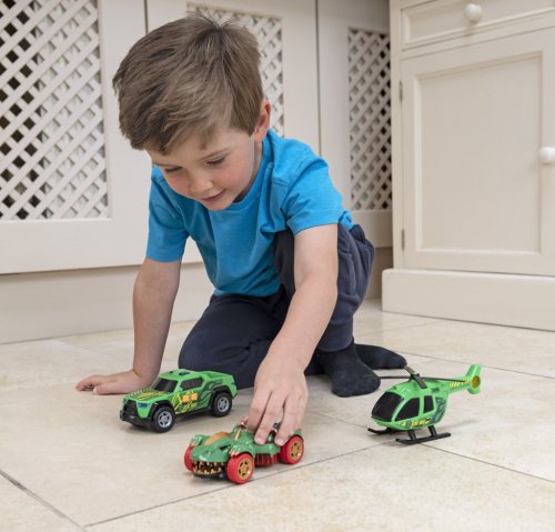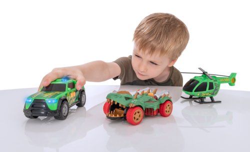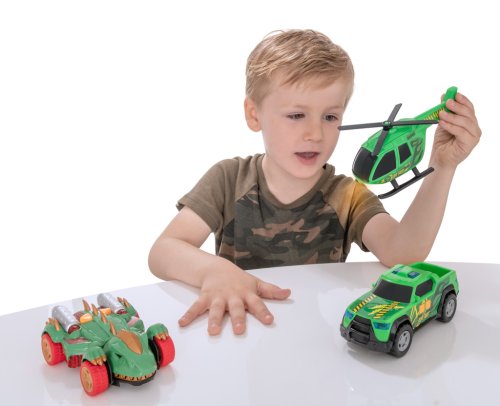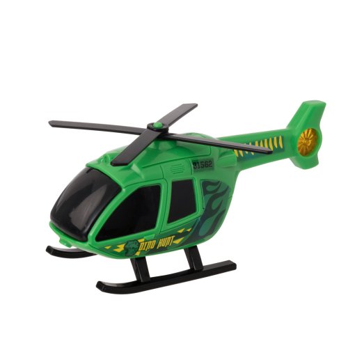 Okrem monštier auta súčasťou balenia je aj helikoptéra Dino Hunt s ručne otáčajúcimi sa listami vrtule, ktorá je perfektná pre náročné letecké honby. Dino Hunt pick-up je vybavený núdzovými sirénami a svetlami, čo pridáva ďalší prvok realizmu pri záchranných misiách.