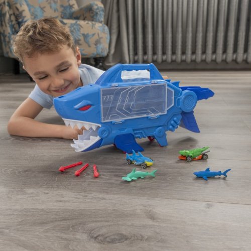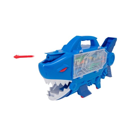Zaži napínavú jazdu so žraločím vozidlom! Spusť svoje vozidlo dole po vnútornej rampe a nechaj ho prejsť žraločími čeľusťami. Stlačením tlačidla odpáliš strely zo žraločej hlavy. Do žraloka si môžeš uložiť až 8 áut. Má praktickú rukoväť pre ľahké prenášanie a voľne pohybujúce sa kolieska pre ešte viac zábavy. Tento set pomáha rozvíjať kognitívne a jemné motorické zručnosti. Vhodné pre deti od 3 rokov.