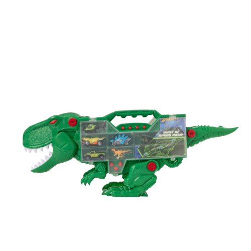 Set je vybavený svetelnými a zvukovými efektmi, čo ešte viac podčiarkuje realistickú atmosféru pri hraní. K tomu sa pridáva otváracia čeľusť T-Rexa, vstavaná rýchlostná rampa a odpaľovač rakiet, ktorý umožňuje ešte väčšiu zábavu a akciu. Deti môžu aktivovať rôzne funkcie a užívať si interaktívnu zábavu pri preprave svojich obľúbených zvieracích autíčok.