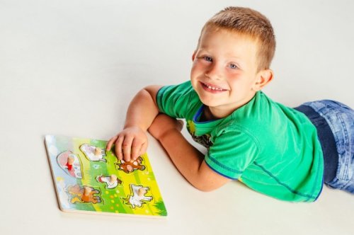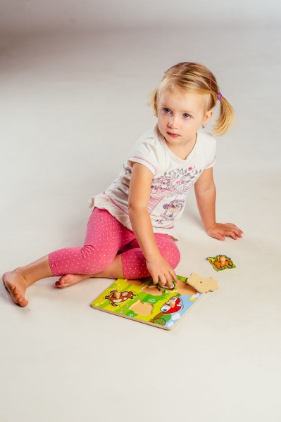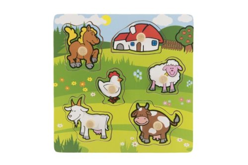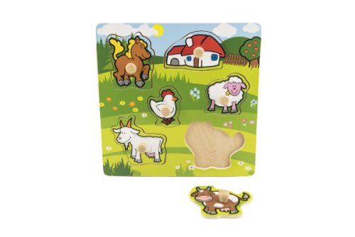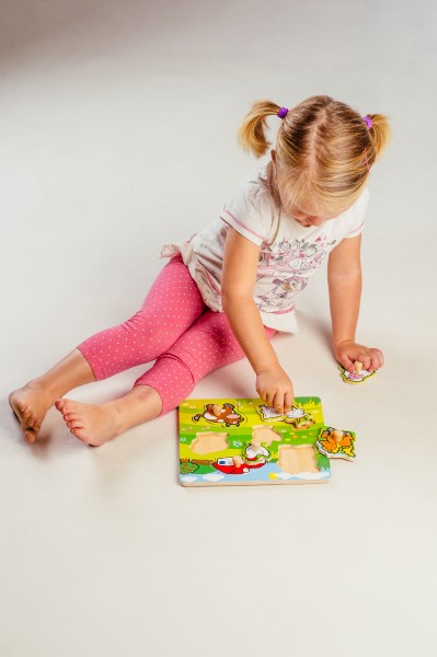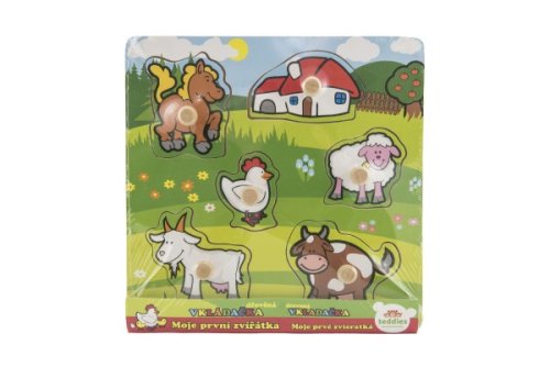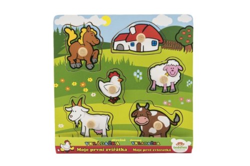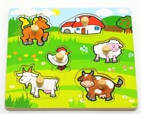 Obsahuje 6 dielikov s úchytmi, ktoré musia deti správne umiestniť do drevenej dosky s otvormi tak, aby získali obrázok lúky so zvieratkami a domčekom. Veľkosť: 22,5 x 22,5 x 2,5 cm Vhodná od 12 mesiacov