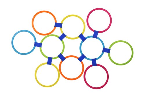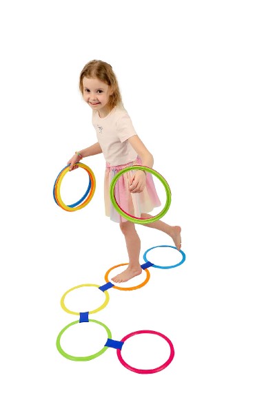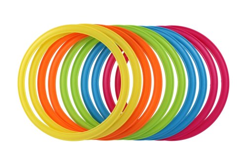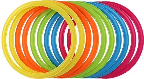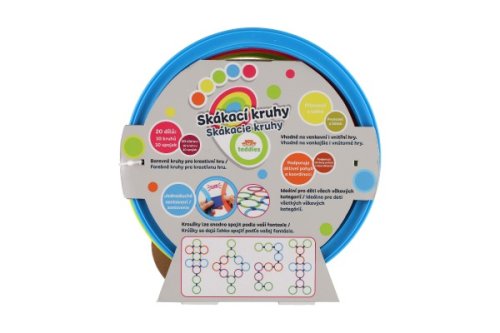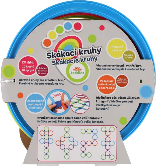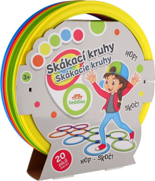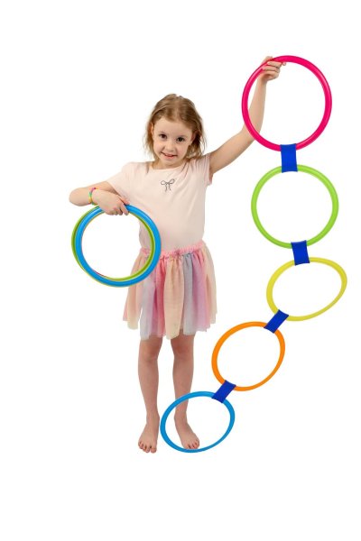 Pestrofarebné krúžky sú obľúbenou pomôckou na cvičenie detí, dospelých či už v školách, iných vzdelávacích zariadeniach alebo len tak vo voľnom čase. Je možné s nimi žonglovať rukami aj nohami alebo treba hádzať na cieľ. Pri nácviku udržania rovnováhy je možné krúžky nosiť aj na hlave po jednom alebo aj viacerých kusoch. Alebo si radšej z krúžkov vytvoríte skákacieho panáka? Je to len na vás! Tieto kruhy podporujú rozvoj osobnosti a fantázie detí i dospelých. Dajte tieto krúžky deťom a uvidíte, ako budú vo vymýšľaní hier kreatívne! V balení je 10 ks krúžkov v piatich farbách a 10 ks spojok, ktorými kruhy môžete spojiť do ľubovoľného tvaru. Priemer krúžku: 27 cm Vhodné pre deti od 3 rokov