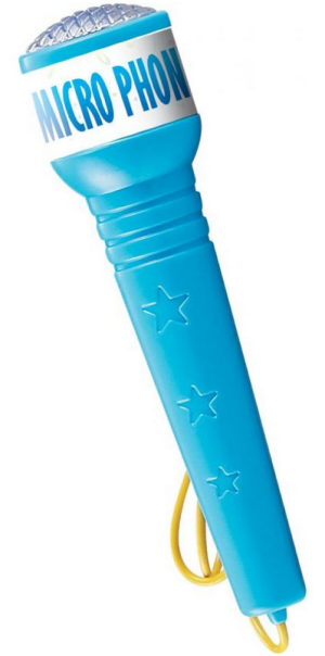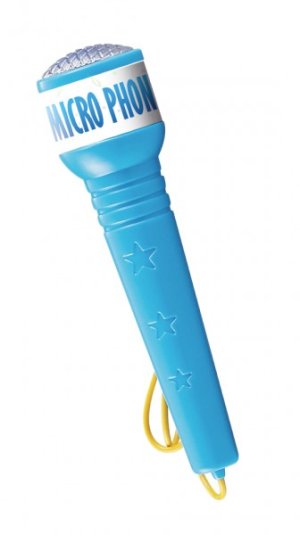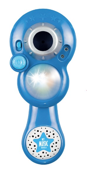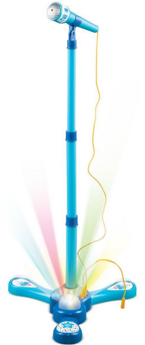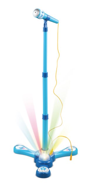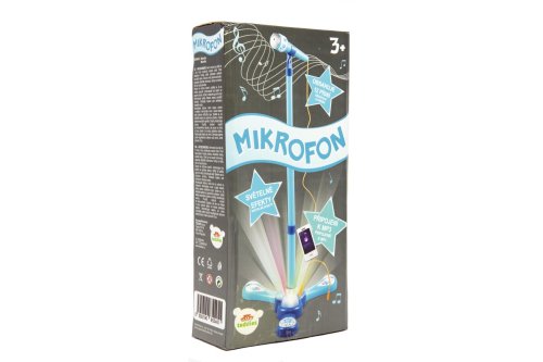 Modrý mikrofón musí byť súčasťou každej karaoke party. S okúzľujúcimi farebnými svetelnými efektmi si budete pripadať ako hviezda na koncerte. Mikrofón obsahuje 12 piesní. Pripojte MP3 alebo mobilný telefón a púšťajte do mikrofónu vlastnú hudbu. Zostavenie: 1.) zostavenie tripodu (podstavca): zasuňte stabilizačné tyčky do podstavca 2.) nasaďte stetoskopickú tyč (tyč, ktorá drží mikrofón) na podstavec 3.) nastave výšku, ktorú potrebujete 4.) pripevnite mikrofón Nastaviteľná výška mikrofónu je 40 - 80 cm. Kábel na pripojenie MP3/mobilného telefónu je súčasťou balenia. Mikrofón je na 3 batérie typu AA. Batérie nie sú súčasťou balenia. Rozmery balenia 17 x 34 x 7 cm. Vhodné pre deti od 3 rokov.