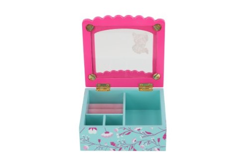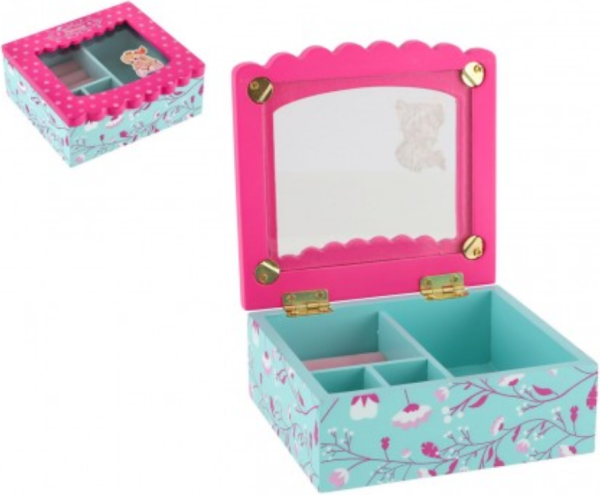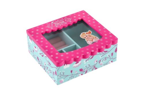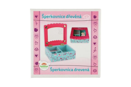 Šperkovnica bude ideálnym miestom na uloženie pokladov každého dievčaťa. Je vyrobená z dreva a má sklenené veko. Šperkovnica má modrú farbu a je pomaľovaná krásnym motívom kvietkov. Veko je ružové, má na sebe kvietky a samolepku princeznej. Táto farebná kombinácia bude ideálny doplnok pre detskú izbu. Vnútri je priestor na organizovanie suvenírov alebo šperkov. Rozmer šperkovnice: 12,5x12x5cm Nie je hračka