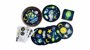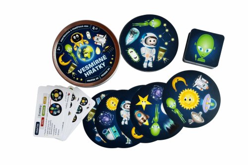 Zábavná kartová postrehová hra balená v malej plechovej krabičke, to sú Vesmírne hrátky, ktoré obsahujú 2 zábavné kartové hry: Hmaťáka a Pexeso. Deti si zábavnou formou zlepšujú postreh a pamäť. Jednoduché pravidlá a krásne maľované obrázky. Pre 2 a viac hráčov. Vhodné pre deti od 3 rokov.