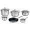 Sada riadu 10 ks Obsahuje panvicu a rôzne veľké kastróly Pokrievky s veľkými a malými otvormi na cedenie vody Vyrobená z prvotriednej nerezovej ocele Na vnútornej strane viditeľné rysky Odolné nitované rukoväte Na panvici nepriľnavý povrch Titanium Kompatibilný so všetkými varnými doskami, vrátane indukcie