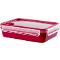 Obdĺžniková dóza s objemom 1,2 l Systém uzatvárania so 4 klipmi po stranách Funkcia ohrievania jedla v mikrovlnnej rúre pomocou ventilu Pevne vlisované tesnenie FreshSeal Bezpečné pre použitie v mikrovlnnej rúre, mrazničke a umývačke V červenej farbe
