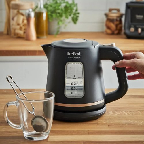 Rýchlovarná kanvica Includeo značky TEFAL bola navrhnutá tak, aby spĺňala potreby aj tých najnáročnejších užívateľov. Značka Tefal vzala do úvahy všetky aspekty, aby vám uľahčila každodenný život - kanvica má veľké, ľahko stlačiteľné tlačidlo na otvorenie/zatvorenie a veľkú ergonomickú rukoväť. Táto skvele navrhnutá elektrická rýchlovarná kanvica s objemom 1 l je ľahká a má na oboch stranách naozaj veľké priehľady na hladinu vody s jasne viditeľnými značkami pre ľahké čítanie. Kanvica je umiestnená na 360 ° podstavci s kontrastným farebným krúžkom, ktorý je vizuálnou pomôckou pre ľahké usadenie kanvice bez ohľadu na uhol. Má tiež veľké, ľahko aktivovateľné tlačidlo na zapnutie/vypnutie so svetelným indikátorom a hubicou na presné nalievanie. Varná kanvica Includeo od značky Tefal: navrhnutá pre vás, vhodná pre každého!