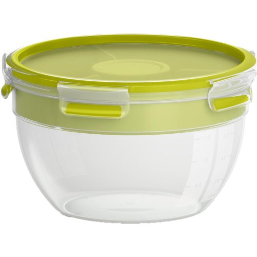 Dóza na šalát objemom 2,6 l Systém uzatvárania so 4 klipmi po stranách Oddelené priehradky na zálievky a dresingy Praktická lyžica a ergonomická rukoväť Vodotesný dizajn V zelenej farbe