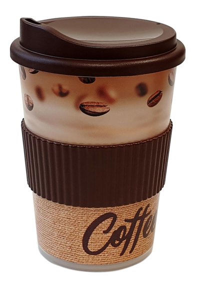 Plastový kelímok s viečkom a náustkom, vhodný na servírovanie kávy. Silikónová manžeta zabraňuje popáleniu od horúceho nápoja, téglik je znovu použiteľný.