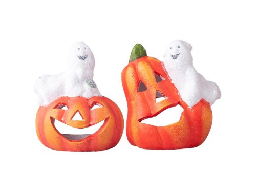 Keramická dekorácia v tvare tekvice s vystupujúcou postavičkou ducha, veľkosť 95×100 mm. Vnútri je priestor na umiestnenie malej sviečky či LED čajovky, ktorá po zapálení vytvorí príjemné svetelné efekty. Ideálna jesenná a halloweenska dekorácia na parapet, stôl či poličku. Dostupná v oranžovej a bielej variante. Tovar je dodávaný v mixe. Doručovaný tovar je vyberaný náhodne a nie je možné vybrať konkrétne prevedenie.