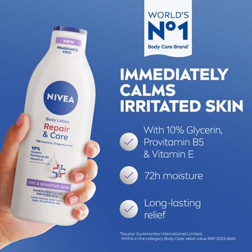 Hydratačné telové mlieko Repair & Care poskytuje intenzívnu a dlhotrvajúcu úľavu suchej a podráždenej pokožke. Je bez parfumácie, a preto je ideálna aj pre citlivú pleť. Klinicky overené zloženie s obsahom 10% hydratačných zložiek účinne upokojuje a podporuje regeneráciu kožnej bariéry až na 72 hodín.