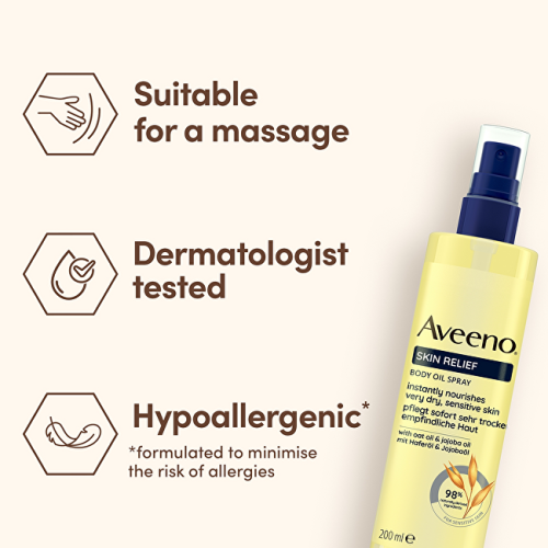 Telový olej v spreji AVEENO® Skin Relief má unikátne zloženie s ovseným a jojobovým olejom. Pomáha regenerovať a upokojiť veľmi suchú pokožku už od prvého použitia. Dodáva pokožke hodvábny efekt a dlhotrvajúcu hydratáciu. Fľaša je recyklovateľná (s výnimkou pumpičky). 98 % ingrediencií prírodného pôvodu.