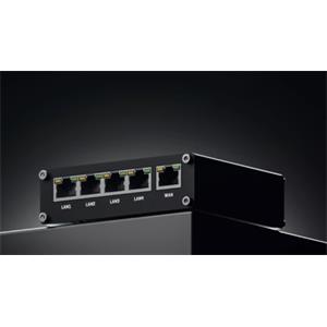 Ponúka 5× 10/100 Mbps RJ-45 (4× LAN, 1× WAN), 2× konfigurovateľný digitálny I/O (vstup/výstup) a 1× USB 2.0 pre ľahkú kompatibilitu s priemyselnými strojmi, podnikovými alebo maloobchodnými zariadeniami. Montáž možná na DIN lištu alebo na stenu (držiak nie je súčasťou balenia).