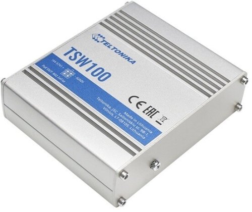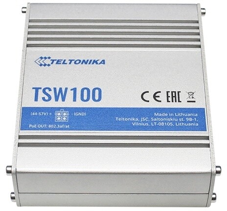 Priemyselný unmanaged switch Teltonika TSW100 od spoločnosti Teltonika Networks je nespravovaný gigabitový ethernetový prepínač s podporou napájania cez ethernet, ktorý ponúka celkom 5 portov RJ-45 (4 z nich s podporou PoE 802.3af/at). Je klasifikovaný ako zariadenie so zdrojom napájania (PSE), centralizuje napájanie, poskytuje až 30 W na port (celkový výkon až 120 W) a znižuje nároky na inštaláciu.