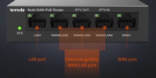 Tenda G0-5G-PoE Gigabit PoE Router je univerzálny router vrátane PoE switcha. MultiWAN, 5x Gigabit RJ45 (3x WAN/LAN, 1x WAN, 1x LAN), 4x LAN PoE+ 802.3 af/at, celkom 55W. Podporuje manažment až 16x WiFi AP Tenda i21, i24, i25, i27, i29, a ďalších. Fast Roaming IEEE 802.11k/v/r, IPSec VPN, PPTP, L2TP, Smart Bandwidth control, DHCP server.