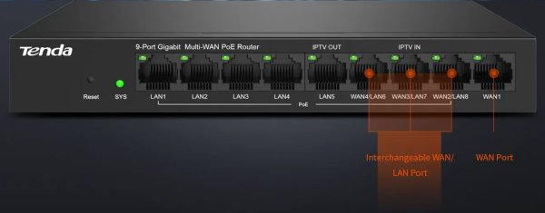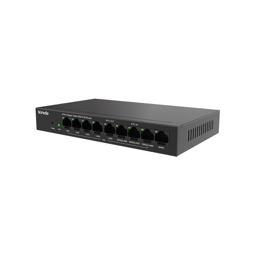 Tenda G0-8G-PoE Gigabit PoE Router je univerzálny router vrátane PoE switcha. MultiWAN, 9x Gigabit RJ45 (3x WAN/LAN, 1x WAN, 5x LAN), 8x LAN PoE+ 802.3 af/at, celkom 95W. Podporuje manažment až 128x WiFi AP Tenda i21, i24, i25, i27, i29, a ďalších. Fast Roaming IEEE 802.11k/v/r, IPSec VPN, PPTP, L2TP, Smart Bandwidth control, DHCP server.
