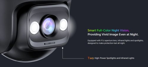 Vonkajšia otočná IP kamera s rozlíšením 3 MPx (2304 x 1296px) a prenosom zvuku, uhol záberu 355 ° horizontálne a 90 ° vertikálne, nočné videnie s dosvitom 30 m, detekcia pohybu, osoby a vozidlá, automatické otáčanie za pohybom, vstavaný mikrofón, vstavaný kartu max. 512 GB, krytie IP65, pripojenie pomocou WiFi 6 alebo Ethernet portu RJ45, aplikácia pre Android a iOS v češtine. Podporuje Amazon Alexa, kódovanie H.265 , ONVIF.