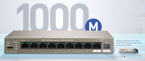 Tenda TEG1110PF-8-102W je 9-portový Gigabitový Ethernet PoE switch s napájaním PoE af/at a SFP portom. 8 portov 10/100/1000 Mb/s je napájaných pomocou PoE 802.3af/PoE 802.3at (celkom 92 W), pre Uplink 1x RJ45 10/100/1000 Mb/s + 1x SFP port 100/100. Ochrana proti prepätiu 6 kV. Prepínanie VLAN, Extend, Standart. Kovový obal. Fanless, bez ventilátorov.