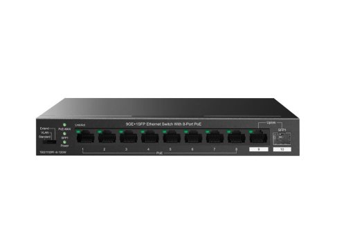 Tenda TEG1110PF-8-120W je 9-portový Gigabitový Ethernet PoE switch s napájaním PoE af/at a SFP portom. 8 portov 10/100/1000 Mb/s je napájaných pomocou PoE 802.3af/PoE 802.3at (celkom 110 W), pre Uplink 1x RJ45 10/100/1000 Mb/s + 1x SFP port 100/10. Ochrana proti prepätiu 6 kV. Prepínanie VLAN, Extend, Standart. Kovový obal. Fanless, bez ventilátorov. Súčasťou balenia je český, slovenský a poľský manuál.