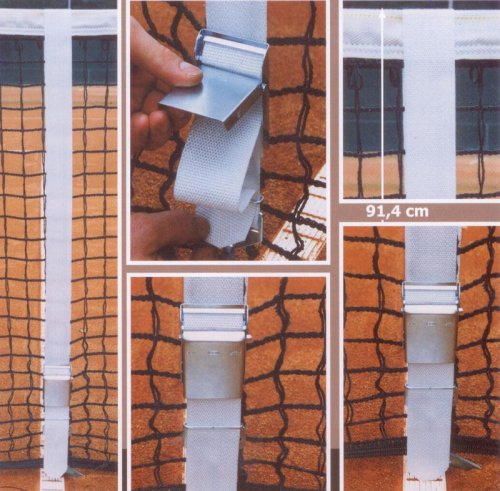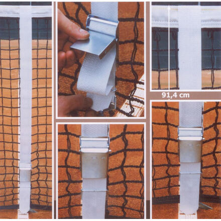 Stredová páska Tenis Exacta Vám pomôže jednoducho a rýchlo nastaviť správnu výšku tenisovej siete. Inštrukcie: Pre správnu výšku siete 91.4 cm nastavte popruh tak, aby značiaci bod ležal na kraji siete a koniec popruhu, aby sa dotýkal zeme. Pás prevlečte cez pracku.