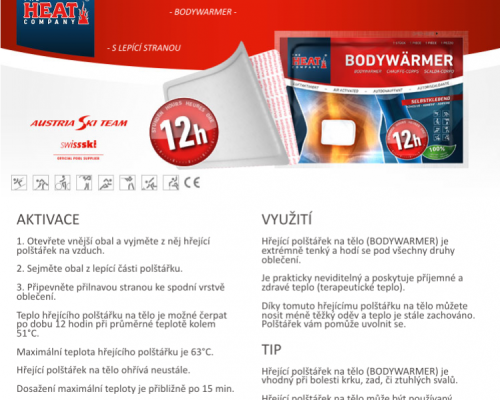 Hrejúci vankúšik na telo (Bodywarmer) je extrémne tenký a hodí sa pod všetky druhy oblečenia. Je prakticky neviditeľný a poskytuje príjemné a zdravé teplo (terapeutické teplo). Vďaka tomuto hrejúcemu vankúšiku na telo môžete nosiť menej ťažký odev a teplo je stále zachované. Hrejivý vankúšik na telo môže byť umiestnený napríklad pod blúzkou alebo košeľou na mieste, kde chcete teplo. Vankúšik vám pomôže uvoľniť sa. Pre zaistenie tepla na Vami určenom mieste je na hrejúcom vankúšiku na telo lepiaca strana, vďaka ktorej môžete prilepiť hrejúce vrecko na vami určené miesto na spodnom prádle. Po tom, čo prestane hrejúci vankúšik na telo hriať, ho vyhoďte do bežného domáceho odpadu.