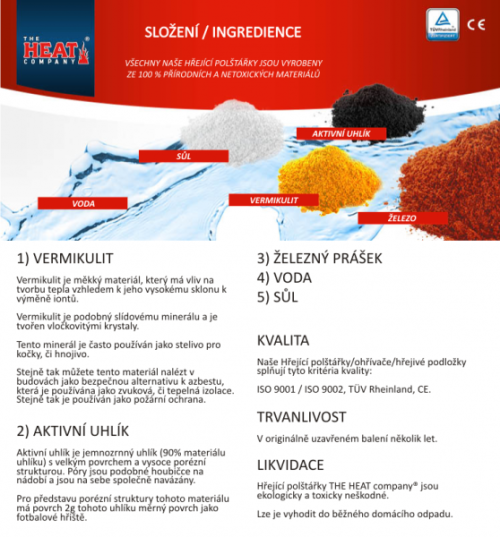 Železný prášok v hrejúcom vankúšiku v kombinácii s kyslíkom obsiahnutom vo vzduchu vytvára reakciu generujúcu teplo. Soľ s vodou pôsobí ako katalyzátor* reakcia uhlíka s vermikulitom, ktorá pôsobí ako rezerva vody.