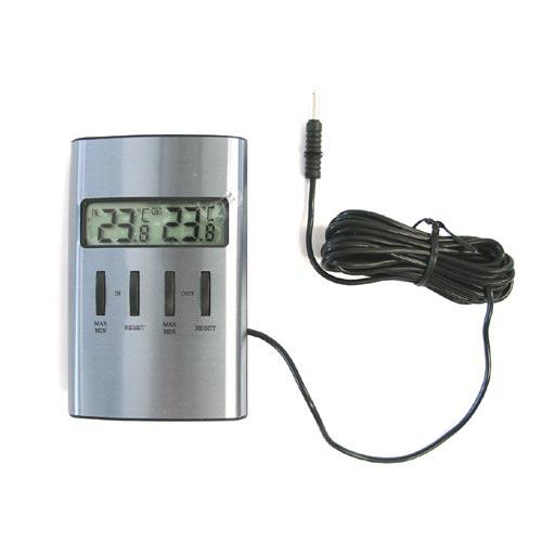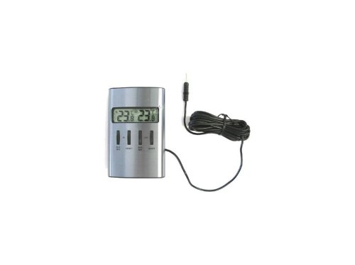 rozmery (Š x H x V): 64 x 22(58) x 98 mm teplotný rozsah: vnútorné: -10/+50 °C; vonkajšia: -50/+70 °C hmotnosť: 63 g súčasťou 1 x 1,5V AA batéria vonkajšia teplota cez kábel (300 cm) funkcia MIN/MAX strieborná metalíza
