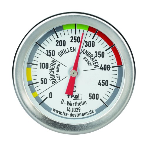 Na kontrolu teploty varnej komory. S farebne označenými rozsahmi teplôt (údenie / grilovanie / opekanie). Vyrobené z vysoko kvalitnej nerezovej ocele. Pre gril alebo udiareň. Ako náhradný diel, na dovybavenie alebo vlastnú výrobu. Nemecké popisky na ciferníku.