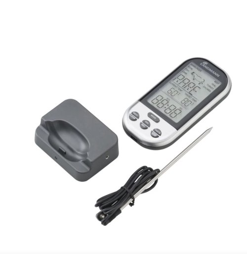 Bezdrôtový rádiový teplomer, dosah 30 metrov. Veľký dobre čitateľný displej. Možnosť nastavenia 8 druhov mäsa a 5 rôznych úrovní grilovania. Nastavenie cieľovej teploty. Automatický alarm pri dosiahnutí zvolenej úrovne varenia. Funkcia stopiek a odpočítavanie. Počet ceruzkových batérií: 4 AAA (nie sú súčasťou balenia). Šírka 6 cm, výška 12 cm, hĺbka 2.5 cm. EAN 4000810136254