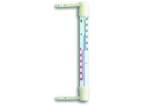 Okenný teplomer s prehľadnou stupnicou na vonkajšie použitie vhodný na pripevnenie na rám okna.