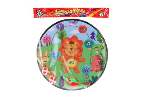 Terč s motívom zvieratiek. Priemer 35 cm. Materiál kartón + látkový poťah. Balenie obsahuje 2 loptičky a 2 šípky z plastu. Balené v sáčku. Rozmery balenia cca 37x42x4 cm. Vek 3+