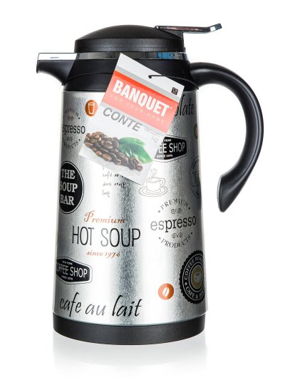 Termokanvica CONTE s potlačou má sklenenú termoizolačnú vložku a vonkajšia časť je vyrobená z kovu a plastu. Termokanvica je vhodná pre teplé aj studené nápoje.