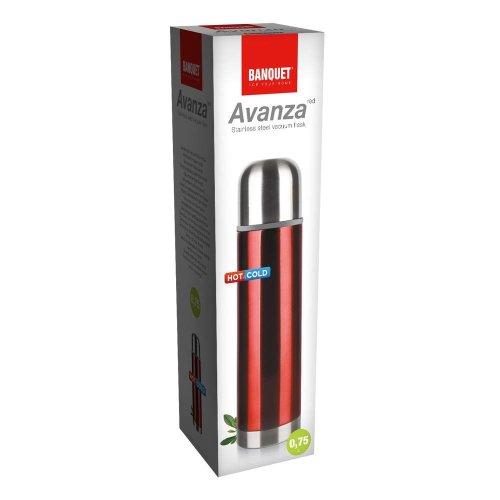 Nerezová termoska AVANZA Red v dvojplášťovom prevedení, je vhodná pre horúce a studené nápoje. Vonkajšia strana je opatrená metalickým povrchom. Plastový uzáver - clip pre jednoduché použitie (jedným stlačením sa termoska otvorí, druhým zavrie), viečko termosky je možné použiť ako pohárik na pitie. Nerezové termosky sú veľmi odolné a bezpečné, nehrozí rozbitie vložky či obarenia pri manipulácii. Teplotný pokles je závislý na teplote nápoja pri plnení, množstve nápoja a teplote okolia.