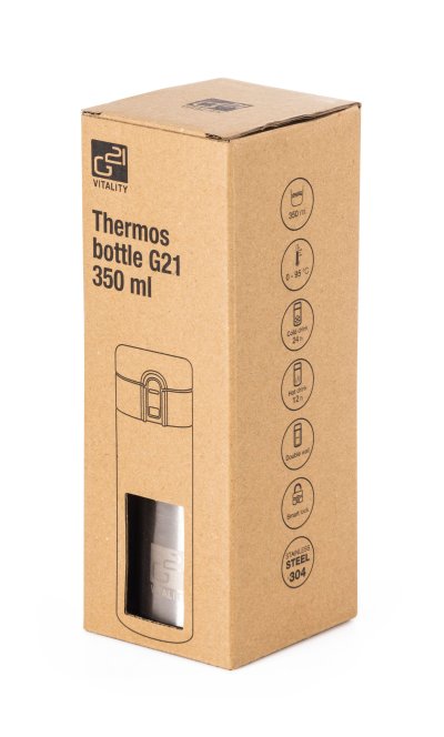 Viečko termofľaše G21 nielenže výborne tesní, ale navyše umožňuje aj pohodlné pitie priamo z fľaše. Vďaka praktickej a spoľahlivej bezpečnostnej poistke viečka sa vám termohrnček G21 sám od seba neotvorí, takže ho môžete bez obáv položiť aj do kabelky alebo batohu.
