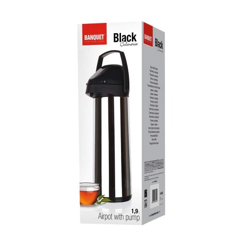 Nerezová termoska s pumpou CULINARIA 1.9 litra, nerezový plášť termosky má lesklú povrchovú úpravu, pumpa je vyrobená v kombinácii nerez/plast, veko, rukoväť a základňa je z čierneho plastu, izolačná vložka sklenená. EAN 8591022336434