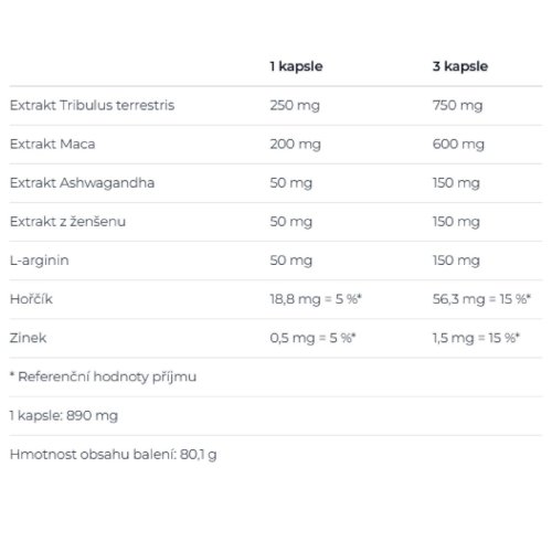 Odpáľte svoj testosterón s Nutrend Test Bomb! 90 kapsúl plných rastlinných extraktov a minerálnych látok na podporu vášho výkonu a vitality. Obsiahnutý zinok dopomáha k udržaniu optimálnej hladiny testosterónu, správnej syntéze bielkovín a správnej funkcii imunitného systému. Prírodné extrakty Tribulus terrestris, Maca, Ashwagandha a ženšen pôsobia synergicky na podporu reprodukčného systému, optimálnej hormonálnej aktivity a celkovej aktivizácie. Pozitívny vplyv na hormonálnu aktivitu a reprodukčný systém má jedna z najvyhľadávanejších bylín Tribulus terrestris alebo kotvičník zemný. S obľubou je vyhľadávaný predovšetkým športovcami pre podporu výkonu, vďaka tomu, že zaistí optimálnu činnosť nervovej sústavy a udržuje normálne svalové napätie. Ashwagandha sa používa za účelom podpory energie, vitality, fyzickej výdrže a duševnej pohody. Rastlina Withania somnifera je malý ker so žltými kvetmi a patrí medzi najmocnejšie byliny ajurvédskej medicíny, inak prezývaná aj ako "indický ženšen". Zinok prispieva k normálnej funkcii imunitného systému, syntéze bielkovín a udržaniu normálnych kostí. Podporuje činnosť reprodukčného systému, s obľubou je vyhľadávaný na udržanie normálnych vlasov, nechtov a pokožky. Zloženie: Extrakt Tribulus terrestris (min. 90 % saponínov), extrakt Maca – Lepidium meyenii, citronan horečnatý, želatínová kapsula (želatína, farbivo oxid železa), L-arginín, extrakt ženšenu (2,2–3 % ginsenoidov), extrakt somnifera – Ashwagandha® (5 % withanolidov), plnidlo stearan horečnatý, protispekavá látka oxid kremičitý, glukonát zinočnatý. Odporúčané dávkovanie: Ráno užite maximálne 3 kapsule. Zapite dostatočným množstvom vody. Neprekračujete odporúčané dávkovanie. Upozornenie: Doplnok stravy. Nenahrádza pestrú stravu. Nie je určené pre deti, tehotné a dojčiace ženy. Ukladajte mimo dosahu detí. Chráňte pred teplom, mrazom, vlhkosťou. Dodávateľ: NUTREND DS ., as ., Chválkovice 604, 779 00 Olomouc, Česká republika