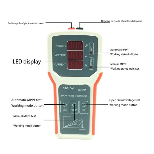 S testerom ELEJOY WS400A otestujete maximálny napájací bod výkonu a napätie naprázdno pri solárnych paneloch. Multimeter sa hodí každému výrobcovi a predajcovi fotovoltaických panelov, inštalačným firmám a užívateľom solárnych panelov.