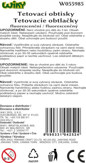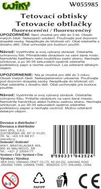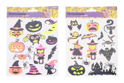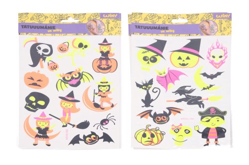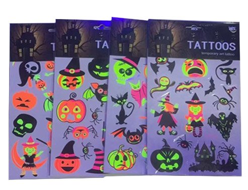 Tetovacie obtlačky v motíve Halloween o veľkosti 16,5x22 cm. Fluorescenčné obtlačky, svietia pod UV žiarením. 4 varianty.