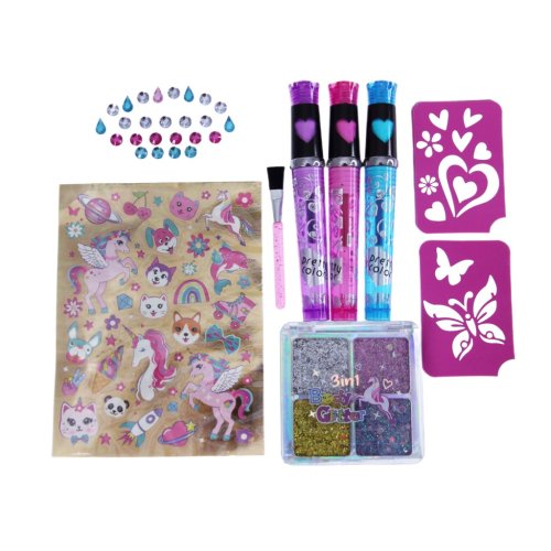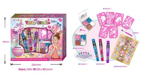 Úžasné tetovacie štúdio, s ktorým si vyzdobíš vlasy a telo farebnými vzormi aj kamienkami. Sada obsahuje tetovanie, ozdobu do vlasov, trblietky na telo, kamienky, šablóny, farebné tetovacie perá. Zaži veľa zábavy a ozdôb seba i kamarátov. Vhodné pre deti od 6 rokov.