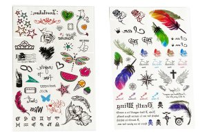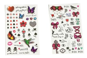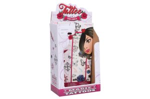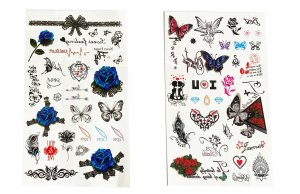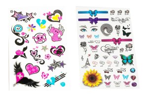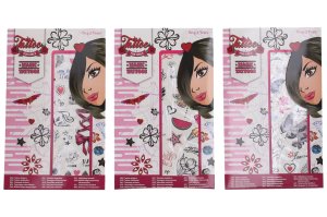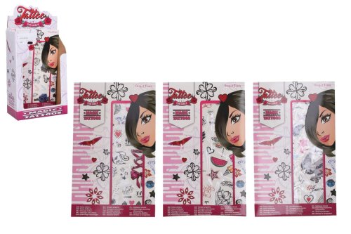 Tetovacie samolepky holky. Viac variantov v display boxe. Rozmery hárku: 15,3x0,1x25cm. Návod na aplikáciu na obale: Zlúpnuť fóliu, prilepiť papier s tetovaním na pokožku, namočiť a pritlačiť hubkou, zložiť opatrne papier.
